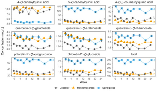 Levels of colorless (poly)phenols in juices derived from three pressing systems in 2020 during 24 weeks of storage at 20 °C. Data represent means and standard deviations of two technological replicates. Relative concentrations of most phenolic compounds monitored were almost stable over time. Different letters (a, b) indicate significantly different (p < 0.05) means of the respective color value at the end of the storage study.