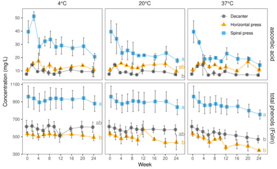 Ascorbic acid and total phenols (Folin–Ciocalteu assay) in juices derived from three pressing systems during 24 weeks of storage at three temperatures (4, 20, and 37 °C) in 2020. Data represent means and standard deviations of two technological replicates. Relative ascorbic acid degradation was substantially more pronounced in spiral filter pressed juices, owing to their higher starting levels. Total phenols were relatively stable regardless of the temperature. Different letters (a, b) indicate significantly different (p < 0.05) means of the respective color value at the end of the storage study.
