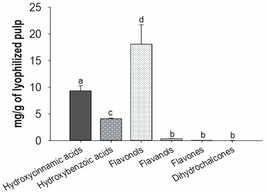 In general, it was determined that the acetone concentration affects the yield of extracted polyphenol compounds, extracting the higher contents of polyphenols at 60–75% acetone and the lower extraction yield at 90–100% (Figure 3). These results are related to the polarity of acetone, the water solubility of polyphenol compounds in acetone mixtures, their chemical structure, and the disposition of their functional groups. Unlike the extraction with aqueous acetone, the methanolic extractions of the quince fruit contain high content of hydroxycinnamic acids (shikimic acid, quinic acid and their derivatives), flavonoids, and proanthocyanidins []. Meanwhile, the use of ultrasound assistance and methanol as extraction solvent, enhances the content of flavonoids, phenolic acids, and lignans [].
