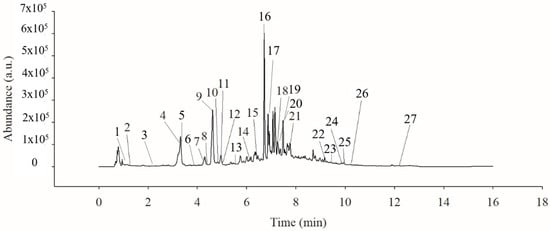 The samples were analyzed for the identification and quantification of phenolic compounds according to the Díaz-Rivas method []. The samples were resuspended in 200 µL of methanol and filtered using 0.45 µm PTFE filters before analysis. The UPLC system consisted of a quaternary bomb (QSM—“quaternary solvent module”) and a sample handler (SM-FTN) Acquity class-H (Waters Corp., Milford, MA, USA) coupled with a tandem Xevo TQ-S triple quadrupole mass spectrometer (Waters Corp., USA). Data were recorded in a multiple reaction monitoring mode (MRM). Data acquisition and processing were performed using MassLinx software (Waters Corp., USA).