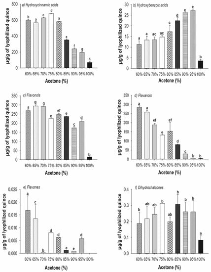 Effect of aqueous acetone on the extraction of polyphenolic compounds in Quince fruit (Cydonia oblonga Mill.). Different letters indicate statistical significance (ANOVA, Tukey p < 0.001).
