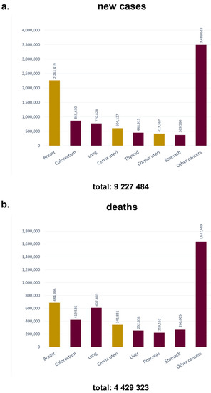- Estimated Number of Deaths in 2020, Worldwide, Females, Ages 0–59 (excl. NMSC). WHO Cancer Today. Available online: https://gco.iarc.fr/today/online-analysis-table?v=2020&mode=cancer&mode_population=continents&population=900&populations=900&key=asr&sex=2&cancer=39&type=1&statistic=5&prevalence=0&population_group=0&ages_group%5B%5D=0&ages_group%5B%5D=11&group_cancer=1&i (accessed on 1 January 2022).