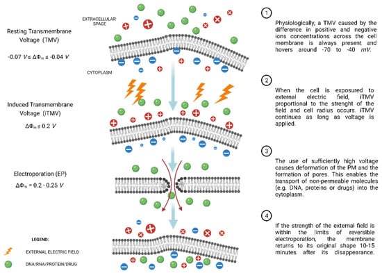 Physiologically, every cell maintains a resting transmembrane voltage (TMV) ranging from −70 to −40 mV [14]. This term describes an electric potential difference between the inner and outer spaces of the PM, resulting from the action of the ion pumps and channels located in the PM, e.g., Na+ and K+ active and passive transport. When the cell is exposed to an external electric field, an induced transmembrane voltage (iTMV), denoted by ΔΨm, occurs that is proportional to the strength of the external electric field and exists as long as the field is present [35].