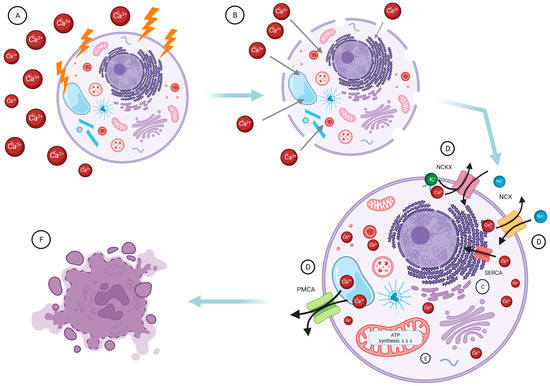 The general mechanism of calcium electroporation (CaEP). The concentration of calcium on both sides of the cell membrane (CM) is tightly controlled. The CaEP mechanism of action involves (A) application of Ca2+ supraphysiological concentration. (B) Subsequent application of electrical pulses which increases the permeability of the CM, which allows calcium introduction into the interior of the cell. (C) Ca2+ transportation to the mitochondria and the endoplasmic reticulum by sarco-endoplasmic reticulum calcium ATPase (SERCA). (D) Disruption of calcium homeostasis triggers the enhanced activity of the sodium-calcium potassium exchanger (NCKX), the sodium-calcium exchanger (NCX), and ATP-dependent plasma membrane calcium ATPase (PMCA) to extrude the extra Ca2+ from the cell. (E) At the same time, an increase in the Ca2+ concentration inhibits the process of ATP synthesis, leading ultimately to the complete use of its resources and cell death (F) [112,114].