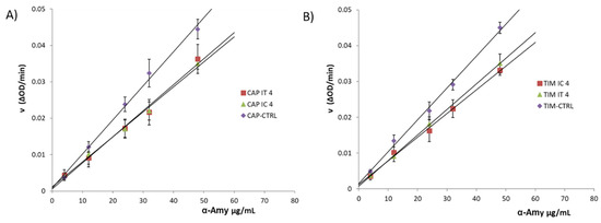 Kinetic analyses were conducted to investigate the reversibility of enzymatic inhibition of the spaghetti with a higher amount of IC and IT compared to the corresponding control samples (Figure 1). The slopes of curves related to the CAP and TIM spaghetti enriched with IC and IT decreased than that of the respective control (CAP-CTRL and TIM-CTRL). Likewise, the straight lines of each group intersected the y-axis at 0, suggesting that the inhibiting process is reversible [35].
