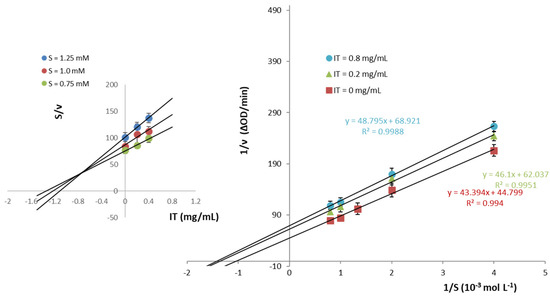 Linear relationships between 1/v and 1/S were observed in the plots. L-B plot obtained for IT indicated an un-competitive inhibition behavior at increasing concentration of IT (from 0 to 0.8 mg/mL) yielding parallel straight lines (Figure 2). Furthermore, the un-competitive inhibition was corroborated by Cornish-Dowden plot, where the data reported as S/v vs. IT concentration gave straight lines crossing in the second quadrant [35]. From the secondary plot, a dissociation constant i of 0.76 mg/mL related to the interaction of inhibitor (I) with the enzyme-substrate complex (IES) was determined.