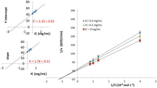 Conversely, both the slopes (Km/vmax) and Y-axis intercepts (1/vmax) of curves of IC increased when the IC concentration increased from 0.0 to 0.4 mg/mL (Figure 3). All the curves intersected at the second quadrant, suggesting IC inhibits α-Amylase through a mixed-type mode that is an intermediate mechanism between non-competitive and competitive inhibition, agreeing with a previous report [35]. The secondary plots of the L-B graphic gave the i and Ki values, thus confirming the above-described mechanism.