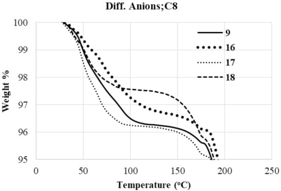 Regardless of the alkyl group length (C8-C18) and the four anions based in the structure of the resulting molecules, the thermograms of the tested derivatives were composed of three stages in the temperature regions: 25–190, 200–450, and 450–700 °C. The first temperature range could be attributed to physically adsorbed water. The molecules that are immiscible with water tend to adsorb water from the atmosphere. On the basis of IR studies, water molecules adsorbed from the air are mostly present in a free state []. A major part of mass loss due to decomposition relates to the middle temperature range, as reported in Table 1. The third range corresponds to the evaporation of any residual decomposition products. It is obvious from Table 1 that there is a large difference between the melting points of the investigated compounds and their previously reported analogues []. The present series contains linear compounds which permit a high degree of intermolecular forces; however, the previously reported ones are angular geometrical structures that are not suitable for close-packed positioning of the molecules. Moreover, the linear structure of the present compounds also enhances the charge separation to illustrate more dipole moments. These findings could be a good explanation for the large difference in the melting points.