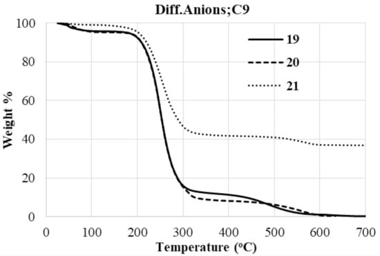 The thermogram of pyridinium ions containing C9 as a side chain and CF3COO- as a counter anion, 21 in Figure 4, demonstrates that the weight loss in the temperature 25–700 °C terminated at 60%, indicating incomplete degradation. This illustrates that numerous separate thermal degradation processes occur in several temperature regimes, and that a nonvolatile solid is created. Mass losses < 100%, indicating solid residue formation, likely through polymerization of the anions or their thermal decomposition products []. No plausible explanation can currently be offered to account for the behavior of the bis-pyridinium 21.