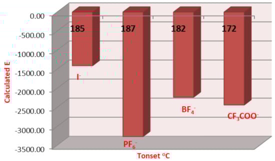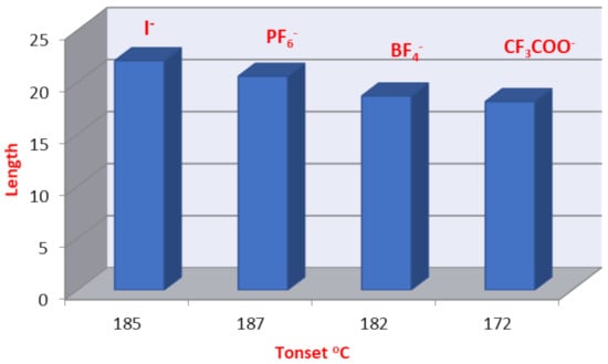 On the other hand, we have investigated the effect of the calculated dimensions with respect to the Tonset as an indicator of the thermal stability. Clearly, the iodide derivative displayed the longer length and the triflouroacetate displayed the shortest. The length and the width of the compounds could be affecting the degree of thermal stability by inducing a degree of van der Waals forces. The regular dependence of the Tonset on the length of the compounds, as the length decreases the Tonset value decreases, except for the PF6- derivative, which could be affected by another factor (Figure 10).
