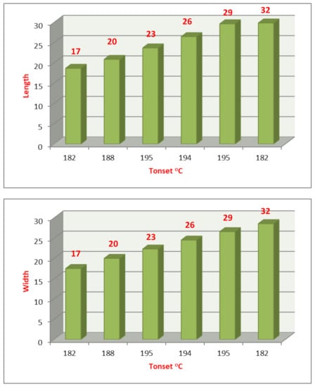 Conversely, the effect of the chain length has also been investigated by calculating the thermal parameters and the dimensions of the prepared compounds of different chain length of the same counter anion. It could be inferred from Figure 12 that the length and width of the compounds affect the thermal stability in a way that has been discussed before; the longer length and the larger width could illustrate the degree of stability because of the higher intermolecular interactions. As the length and width increase, the Tonset increases up to C-12, then a constant value until C-16, then it decreases again at C-18.