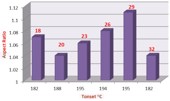 Finally, one of the important factors that could affect thermal stability is the aspect ratio: the ratio of the length to the width of the compounds. As the aspect ratio increases, more backing of the compounds could be permitted and consequently, the thermal stability could be enhanced. The irregular dependence of the Tonset on the length of the chain in C-18 (Figure 13) could be explained by the lower value of the aspect ratio of C-18 derivative.