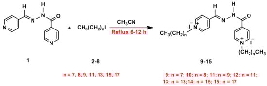 For this purpose, we have planned the synthesis of novel dicationic bis-pyridinium hydrazones encompassing amphiphilic long chain tethers, starting from bis-pyridine hydrazone 1, which was prepared as reported in the literature []. Initially, we performed thermal alkylation of bis-pyridine hydrazone 1 with two equivalents of the appropriate alkyl iodide with long carbon chains ranging from C8 to C18, furnishing on the formation of the desired dicationic pyridinium hydrazones 9–15, tethering lipophilic side chain as counter cation and iodide as counter anion (Scheme 1).