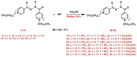A metathetical reaction was adopted to develop a novel series of amphiphilic dicationic pyridinium hydrazones with fluorinated anion tethers, as depicted in Scheme 2. Thus, the displacement of the iodide anion was carried out through the treatment of compounds 9–15 with some selected fluorinated metal salts, namely potassium hexafluorophosphate (KPF6), sodium tetrafluoroborate (NaBF4), and/or sodium trifluoroacetate (NaCF3COO), in refluxing acetonitrile, yielding a library of amphiphilic dicationic pyridinium salts bearing hydrazone linkage and fluorinated anion.