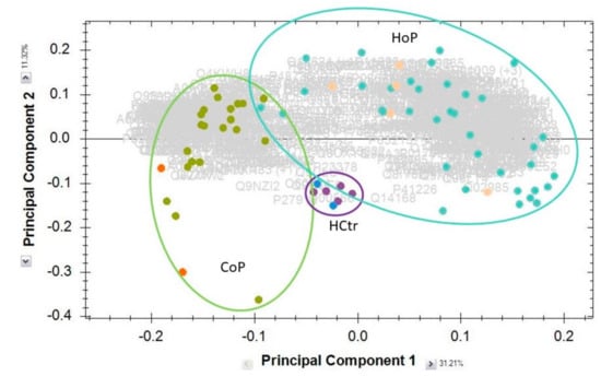 Figure 1. Principal components analysis of shortlisted results from HDMS-based expression analysis (protein assignment by at least two peptides, fold value > 2, ANOVA p ≤ 0.05). The majority of the samples came from males. Light (HoP) and dark orange (CoP) and blue (HCtr) dots indicate the samples from the few participating females. Sample groups were separated as indicated by ellipses.