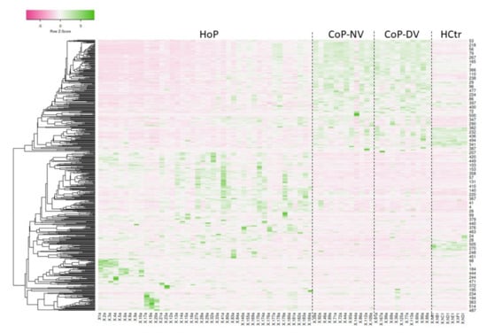 Sera were tryptically digested and measured by HDMS. In the entire dataset, 523 proteins matched the filter criteria (protein assignment by at least two peptides, fold value of at least two, significance of ANOVA p ≤ 0.05) and were analyzed further (for data, see Supplementary Materials, Sheet S1). Principal components analysis (PCA, Figure 1) demonstrated separation of the HoP, CoP and HCtr samples of the hospitalized, convalescent and healthy probands, indicating the presence of differentiating protein factors. The protein list with the up- and downregulated proteins in each case is given in the Supplementary Materials, Sheet S1. In PCA, the samples from females did not separate from those of males, confirming the earlier observation [2] that gender effects were not of importance in these experiments. A glance at the heatmap (Figure 2) shows the reason for the PCA result: the concentrations of a great number of proteins differed considerably among HoP, CoP and HCtr, as shown by the areas with matching colors. Interestingly, HCtr and CoP (NV and DV) presented largely as uniform groups, whereas in HoP, distinct protein and sample subgroups were noted. The protein patterns among the HoP samples differed too much for a reasonable joint analysis against CoP and HCtr (Figure 3B). Therefore, by visual inspection, groups G1–G6 were assigned, each of which contained samples, which roughly shared the same protein profiles. Three samples (E) were excluded, because they did not seem to fit into any group or form their own. Boxplots for selected proteins (CRP-G2, G6; CD14-G1; albumin-G2, G3, G6, CoP; CFHR3-G4, G5) exemplarily demonstrate the major differences among groups (Figure 3A). Complement factor H-related protein 3 (CFHR3), e.g., was one of several proteins that distinguished G4 and G5 from the other groups; it has been associated with the atypical hemolytic-uremic syndrome and defects in the complement alternative pathway [6,7].