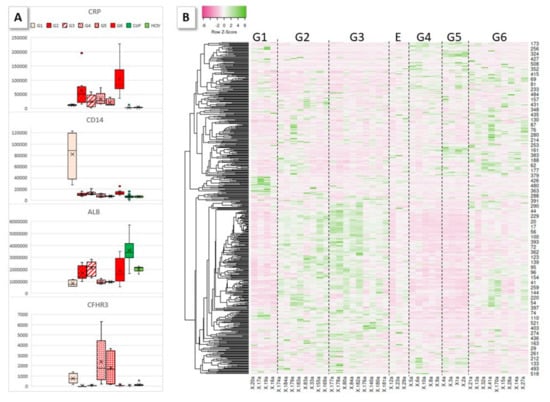 Figure 3. Heatmap of shortlisted results from HDMS-based expression analysis (accumulated ion intensities, protein assignment by at least two peptides, fold value > 2, ANOVA p ≤ 0.05; Spearman Rank correlation; sample label vs. protein number) for the HoP group (B). Groups G1–G6 were assigned by visual inspection. E represents three samples, which were not considered as a separate group and were excluded from further analysis based on their differing individual protein profiles. (A) Boxplots of accumulated ion intensities for CRP (G2, G6), CD14 (G1), albumin (G2, G3, G6, CoP) and CFHR3 (G4, G5) are shown as examples for proteins which were abundant in some groups and not in others.