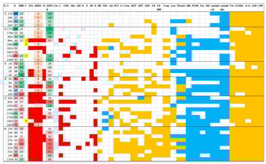 Figure 4. Visual matrix of patient data and clinical parameters (for details, see [2]). G, group; S, sample; A, age; BMI, body mass index; F, female; ICU, intensive care unit; ARDS (1), disease severity (0-no O2, 2-with O2); D, death; Cor, cortisone treatment; C, coinfection; CHD, coronary heart disease; Dia, diabetes; CID, chronic inflammatory disease; K, kidney disease; P, pulmonary disease; M, malignome; H, arterial hypertonia; Bil, bilirubin; Lip, lipase; U, urea; Crea, creatinine; Trop, troponin; Leu, leucocytes, Throm, thrombocytes; Alb, albumin; Ery, erythrocytes; Lymph, lymphocytes relative/absolute; Fer, ferritin; D-Dim, D-dimers. Orange—values higher than normal, blue—values lower than normal. Red—presence of co-morbidity and a general marker for death, ICU, high BMI and old age. Light blue—cortisone treatment. Green-to-red scale for SAPS II, BMI and age.