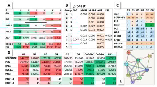 Figure 5. Properties of G1–6. (A) Average values for patient parameters (color series: red, worst values; green, best values). In the order G1–G3–G5–G4–G2–G6, the percentages of normal clinical values (%NCV) decreased and SAPS II increased. Average ion intensities for angiotensinogen (AGT) also rose in the series, as did DBK1-5, which additionally showed a second peak in group 3—matching enhanced ion intensities of coagulation factor 12 (F12, Hageman factor) in G3. (B) T-test results for significant differences in HDMS ion intensities of selected proteins. The AGT concentration differed between G1 and G6 and all other groups. (C) Matrix to visualize concentration differences for selected proteins as determined based on their HDMS ion intensities and the DBK degradation results [2] with respect to HCtr. n, normal; d, downregulated (low values); dd, more downregulated; u, upregulated (high values); uu, more upregulated. U for DBK1-9 means low DBK degradation capacity. (D) Average HDMS ion intensities and DBK results [2], color-coded (green—normal). (E) Network of the eight selected proteins formed by String analysis.