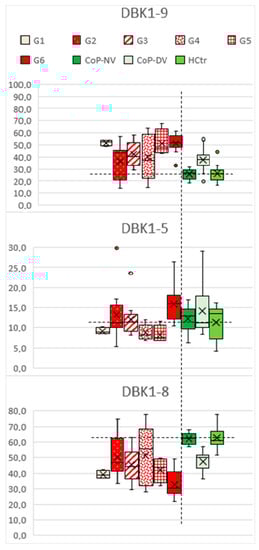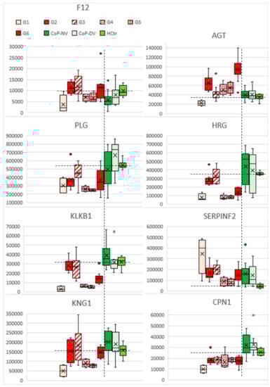 Incidentally, DBK1-9 and DBK1-8 differed significantly between CoP-NV and CoP-DV [2] (Figure 6). A reason for this observation could not be derived from the expression of above eight proteins, as they did not change much between those two groups. The proteins PLG, HRG, KNG1, SERPINF2, F12 and CPN1 did, however, show much more fluctuation for CoP compared to HCtr, which possibly reflected enzyme re-balancing during the healing process.