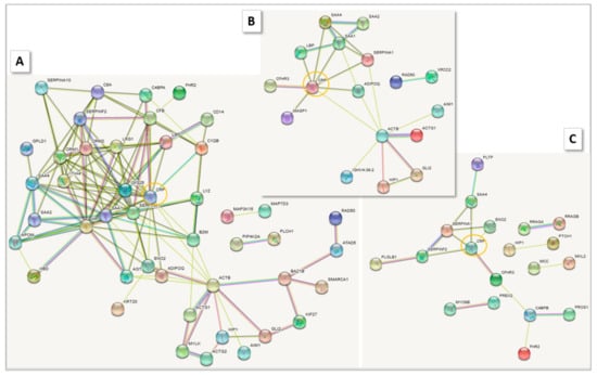 Figure 9. String networks for (A) G6, (B) G5 and (C) G1, of the most abundantly upregulated proteins (confidence at least 50) in the comparison to HCtr. CRP is highlighted.