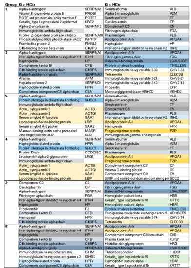Figure 10. Top 10 most regulated proteins (based on highest confidence) for groups G1 to G6 in comparison to HCtr. Upregulated: G > HCtr, downregulated: G < HCtr. Color-coding highlights the same proteins in different groups.