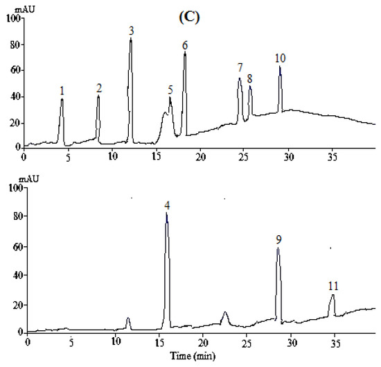 Phenolic contents detected in Berberis vulgaris fruits collected from (A): Jilin province, (B): Heilongjiang province and (C): Liaoning province. 1: Gallic acid, 2: Catechin acid, 3: Chlorogenic acid, 4: Vanillic acid, 5: Caffeic acid, 6: Syringic acid, 7: P-coumaric 8: Feulic, 9: Rutin acid, 10: O-coumaric acid and 11: Quercetin acid.