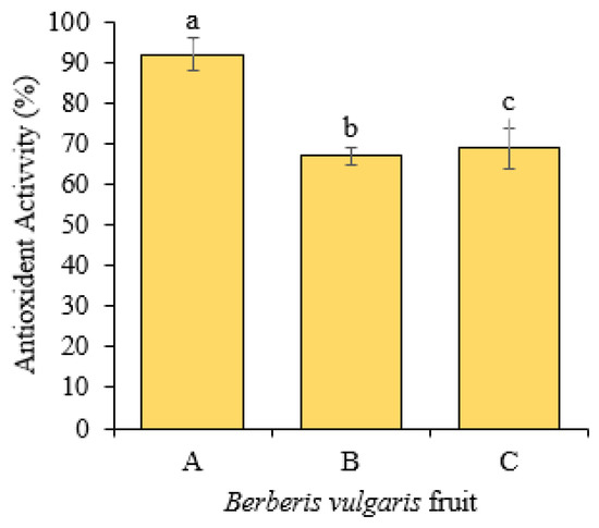 Antioxidant activity (%) of Berberis vulgaris fruits collected from A: Jilin province, B: Heilongjiang province and C: Liaoning province. Each value is a mean of five replicates ± SD. Similar lettering shows no significant difference according to LSD test.