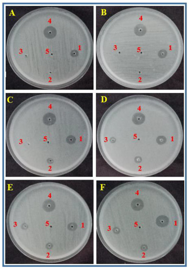 Zones of inhibition produced by Berberis vulgaris fruit extracts. 1: Jilin province, 2: Heilongjiang province, 3: Liaoning province, 4: Positive control (antibiotic) and 5: negative control (methanol) against food born bacteria (A): S. aureus, (B): L. monocytogenes, (C): E. coli, (D): P. fluorescens, (E): V. parahaemolyticus and (F): A. caviae.