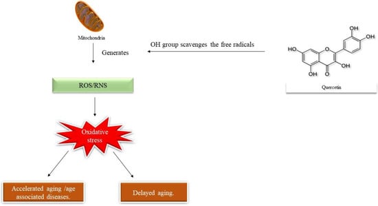 Quercetin is a known flavonoid that when present in circulation ameliorates vascular health and when present in conjugated form reduces the occurrence of cardiovascular disorders. Quercetin exhibits its antioxidant activity and can lower the severity of senescence in case of mice and increases the life span of C. elegans by 15% [56].