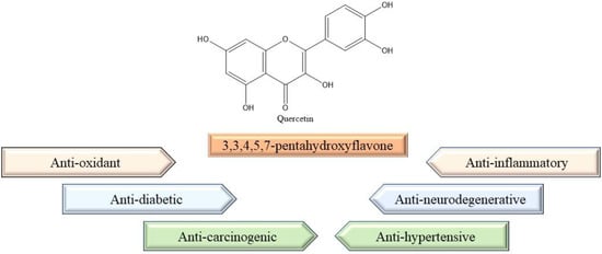 Quercetin is a potent molecule that can be used to cure various health-related issues. Quercetin manifests antioxidant properties both in vivo and in vitro. Free radical scavenging activity of quercetin protects from various age-associated disorders [9]. A diet rich in quercetin has various health-promoting benefits. It acts as an agent to lower coagulation, hyperglycemia, inflammation, and hypertension. Various clinical studies show that supplementation of quercetin is used to prevent and treat various chronic diseases such as cardiovascular disorders [10].