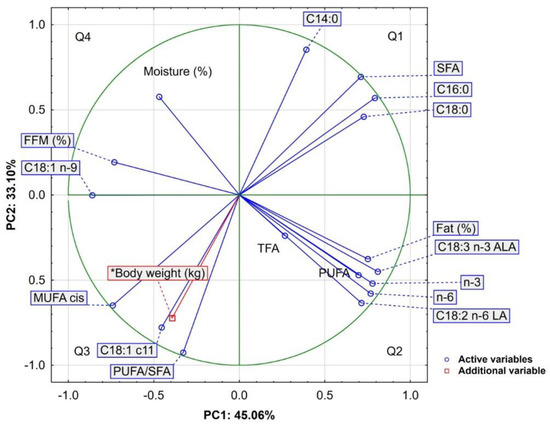 Additionally, based on the loadings and length of the directional vectors, three apparent groups of parameters can be distinguished (Figure 1). The first group of variables, comprising of SFA, C14:0, C16:0, and C18:0, was distributed in the upper right quadrant (Q1) of the graph, situated in both positive areas of the principal components (PC1 and PC2). The second group included fat (%), C18:3 n-3 ALA, n-3, n-6, C18:2 n-6 LA, and PUFAs, which were located in the bottom right quadrant (Q2), as defined by positive PC1 and negative PC2 values. The third group, which comprised of MUFA, PUFA/SFA, C18:1 c11, and body weight, was located in the bottom left quadrant (Q3), as defined by negative values of both principal components (PC1 and PC2).