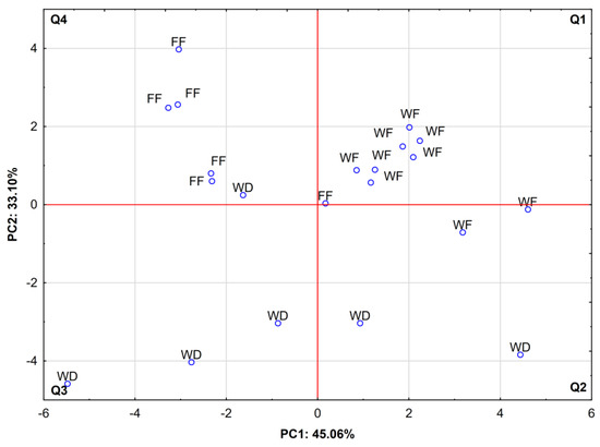 Figure 2 shows the projection of cases, depending on the red deer living conditions and animal category (wild fawns vs. farm fawns vs. wild does) in the coordinate system, as defined by PC1 × PC2. In general, two groups with high spatial clustering can be distinguished. The first group consisted of wild deer fawns’ BM, located in the upper right quadrant (Q1), i.e., designated by positive values of PC1 and PC2, and strongly correlated with saturated fatty acids (Figure 1). The second group consisted of farmed fawns’ BM, located in the upper left quadrant (Q4), which is assigned with negative values of PC1 and positive values of PC2, which characterize the moisture and fat-free dry matter percentages (Figure 1). In contrast, samples from the BM of wild does were the most dispersed and mainly located in both bottom quadrants (Q2 and Q3), which are well-correlated with body weight, monounsaturated, and polyunsaturated FAs (Figure 1).