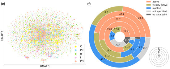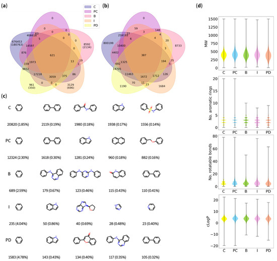 Analysis of individual compound/bioactivity databases to assemble a consensus dataset (C = ChEMBL, PC = PubChem, B = BindingDB, I = IUPHAR/BPS, and PD = Probes & Drugs). From PubChem, only compounds that were also included in at least one of the other databases were considered and the data in PubChem referring to these compounds were used to validate and curate chemical structure and biological activities. (a,b) Venn diagrams of the data collected from the five different databases and created by compound ID (a) or SMILES (b). The numbers of shared and not-shared molecules are reported and the numbers of unique scaffolds are in round brackets. (c) The five-most frequently occurring Murcko scaffolds present in the databases. (d) Distribution of molecular weight (MW), number of aromatic rings, rotatable bonds, and octanol–water partition coefficients (cLogP) per database. (e) UMAP of 2000 randomly selected molecules from each database. (f) Percentage pie chart of records labeled as active (activity log-value higher than 6), weakly active (activity log-value between 5 and 6), inactive (activity log-value lower than 5 or labeled inactive), not specified (no activity log-value), and no data point. Each ring represents a database in the order shown in the legend. Percentages below 5% are not displayed.