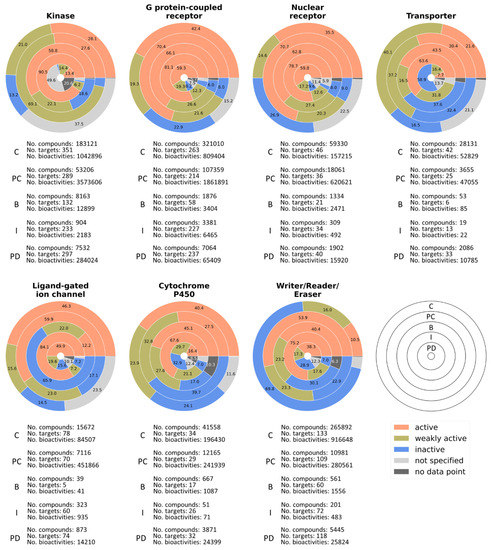 Percentage pie chart of the bioactivity labels for seven important target families and detailed numbers of associated targets, compounds, and bioactivities (C = ChEMBL, PC = PubChem, B = BindingDB, I = IUPHAR/BPS, and PD = Probes & Drugs). Each ring represents a database in the order shown in the legend. Percentages below 5% are not displayed.