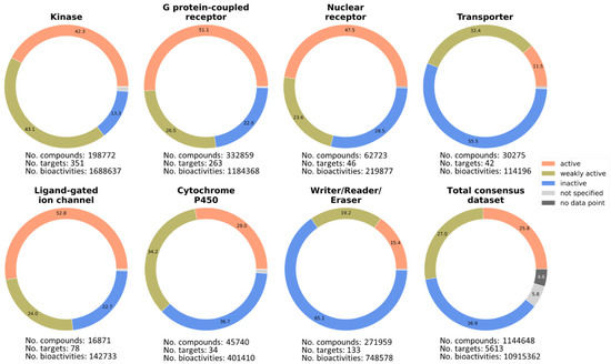 Percentage pie chart of the bioactivity labels of the complete consensus dataset for seven important target families with detailed numbers of associated targets, compounds, and bioactivities.