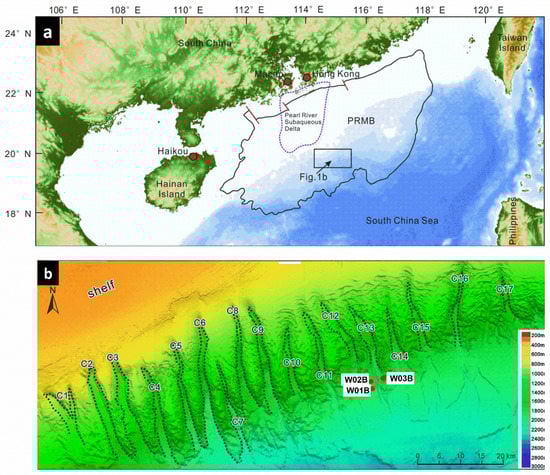 (a) Location of the Shenhu area in the Baiyun Sag of the Pearl River Mouth Basin (PRMB), South China Sea (SCS), modified from [24]; (b) location of the hydrate coring sites of this study—W01B, W02B, and W03B. C1–C17 refer to 17 canyons in the Shenhu area, modified from [10,21,25].