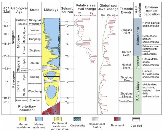 - Zhang, L.L.; Shu, Y.; Cai, G.F.; Long, Z.L.; Liu, D.Q.; Wang, F. Eocene-Oligocene sedimentary environment evolution and its impact on hydrocarbon source conditions in eastern Pearl River Mouth Basin. Acta Pet. Sin. 2019, 40, 153–165. [Google Scholar]