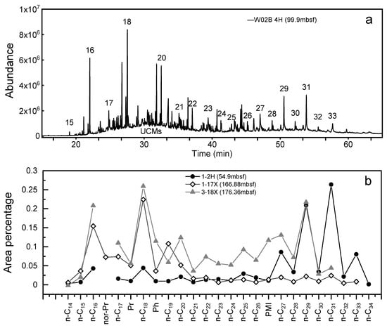 (a) Total ion chromatogram (TIC) of extracts from the studied sample W02B-4H (99.9 mbsf); (b) representative n-alkane composition from W01B-2H (54.9 mbsf), W01B-17X (166.88 mbsf), and W03B-18X (176.36 mbsf).