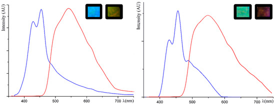 Normalized emission curves were recorded on crystalline thin film samples of Ac1 (blue curve), and Ac2 (red curve) before (on the left) and after (on the right) the annealing treatment at 140 °C. In the inset the spin-coated thin films used for recording the emission spectra, were photographed under the UV lamp at 365 nm.