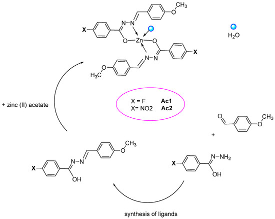 By reacting the related ligand with zinc (II) acetate the two complexes were obtained. As an example, the synthesis of Ac2 is described. An amount of 0.600 g (2.00 mmol) of the ligand 4-nitro-N′-(4-methoxybenzylidene) benzohydrazide was dissolved in 12 mL of dry 1,1,2,2, TCE. Zinc (II) acetate (0.183 g, 1.00 mmol) was added to the solution under stirring at 150 °C. After 45 min, the solution was poured into 40 mL of hexane. The precipitated solid was recovered by filtration and purified by crystallization in dichloromethane/hexane. Yield: 70%.