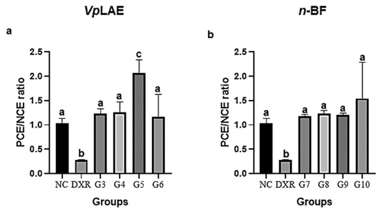 Evaluation of the cytotoxic potential of Vernonanthura polyanthes leaves aqueous extract (VpLAE) and its n-butanol fraction (n-BF) on mouse bone marrow cells using the micronucleus test. The animals were treated with different concentrations of VpLAE or its n-BF fraction. (a) Polychromatic erythrocytes (PCE)/normochromatic erythrocytes (NCE) ratio of animals treated with VpLAE (G3: 250 mg/kg, G4: 500 mg/kg, G5: 1000 mg/kg for 24 h, and G6: 1000 mg/kg for 120 h). (b) PCE/NCE ratio of animals treated with n-BF (G7: 250 mg/kg, G8: 500 mg/kg, G9: 1000 mg/kg for 24 h, and G10: 1000 mg/kg for 120 h). NC: negative control (mineral water); DXR: positive control (doxorubicin: 50 mg/kg ip). Results are expressed as the mean ± standard deviation. The groups were compared by ANOVA (Vplae) or Kruskal–Wallis (n-BF) followed by the respective Tukey or Dunn’s tests. Different letters indicate statistically significant differences between groups (p < 0.05).