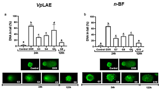 Evaluation of the genotoxic potential of Vernonanthura polyanthes leaves aqueous extract (VpLAE) and its n-butanol fraction (n-BF) on mouse bone marrow cells using the comet assay. The animals were treated with different concentrations of VpLAE or its n-BF fraction. The parameter used to assess genetic damage was % DNA in the tail. (a) VpLAE (G3: 250 mg/kg, G4: 500 mg/kg, G5: 1000 mg/kg for 24 h, and G6: 1000 mg/kg for 120 h). (b) n-BF (G7: 250 mg/kg, G8: 500 mg/kg, G9: 1000 mg/kg for 24 h, and G10: 1000 mg/kg for 120 h). NC: negative control (mineral water); DXR: positive control (doxorubicin: 50 mg/kg ip). Results are expressed as the mean ± standard deviation. The groups were compared by ANOVA followed by the Tukey test. Different letters indicate statistically significant differences between groups (p < 0.05). Images below graphs are representative photomicrographs of nucleoids stained with DiamondTM Nucleic Acid Dye. The images were captured using a fluorescence microscope (Axioplan-ImagingVR) and the Lucia software, with an excitation filter of 510–560 nm and a barrier filter of 590 nm (10× objective).