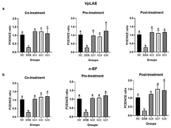 The evaluation of VpLAE and n-BF anti-cytogenotoxicity in the presence of the DXR positive control (co-, pre-, and post-treatments) was also performed. VpLAE and n-BF were anti-cytotoxic in all doses (250, 500, and 1000 mg/kg) and in different treatment schemes used in this work (Figure 4). The PCE/NCE ratios in treatments of DXR + VpLAE or n-BF were restored to the ratio obtained in the negative control (Figure 4). Regarding antigenotoxicity, VpLAE reduced the DXR genotoxicity by ~27% during co-treatment (Figure 5a). In contrast, n-BF did not demonstrate anti-genotoxic potential in the co-treatment with DXR (Figure 5b). Regarding pre-treatment, VpLAE and n-BF reduced the genotoxicity of DXR by ~41% (Figure 5). In the post-treatment, VpLAE and n-BF also reduced the genotoxicity of DXR by ~47% (Figure 5). Moreover, the association of VpLAE or n-BF with DXR in the co-, pre-, and post-treatments showed a significant reduction in the frequency of MN/PCE when compared to the positive control (Figure 6), revealing a relevant anti-genotoxic effect of V. polyanthes.