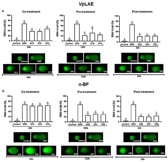 The antigenotoxic potential of VpLAE and n-BF (in the presence of DXR) was also evaluated in co-, pre-, and post-treatment schemes by comet assay. The results revealed that VpLAE and n-BF reduced DXR genotoxicity by ~38%. The exception is n-BF co-treated with DXR, which could not protect the DNA. Similar results were observed for VpLAE and its fractions (aqueous, ethyl acetate, and n-butanol) co-treated with DXR in human lymphocytes. V. polyanthes decreased DXR genotoxicity by ~15% [21]. However, previous results with D. melanogaster showed that VpLAE potentiated DXR genotoxicity when both were administered in a co-treatment regimen [19].