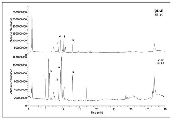 Total ion chromatograms (TIC) of Vernonanthura polyanthes leaf aqueous extract (VpLAE) and its n-butanol fraction (n-BF) analyzed by UHPLC-UV-MS (Orbitrap) in the negative ionization mode. 1, 3-O-caffeoylquinic acid; 2, 5-O-caffeoylquinic acid; 3, 4-O-caffeoylquinic acid; 4, 5-O-feruloylquinic acid; 5, rutin; 6, 3,4-di-O-caffeoylquinic acid; 7, 3,5-di-O-caffeoylquinic acid; 8, 4,5-di-O-caffeoylquinic acid; IS, internal standard (hydrocortisone 10 mg/mL).