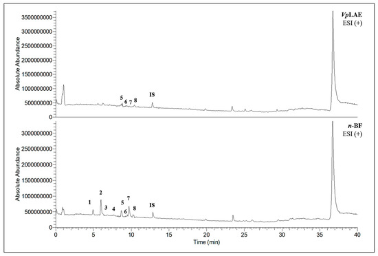 Total ion chromatograms (TIC) of V. polyanthes leaf aqueous extract (VpLAE) and its n-butanol fraction (n-BF) analyzed by UHPLC-UV-MS (Orbitrap) in the positive ionization mode. 1, 3-O-caffeoylquinic acid; 2, 5-O-caffeoylquinic acid; 3, 4-O-caffeoylquinic acid; 4, 5-O-feruloylquinic acid; 5, rutin; 6, 3,4-di-O-caffeoylquinic acid; 7, 3,5-di-O-caffeoylquinic acid; 8, 4,5-di-O-caffeoylquinic acid; IS, internal standard (hydrocortisone 10 mg/mL).