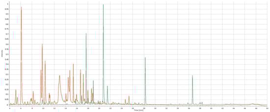 The difference between the chemical profiles of roselle and calendula, HPLC, 270 nm. Orange—chromatogram of roselle extract; green—chromatogram of calendula extract.