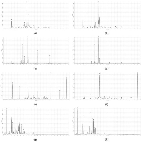 HPLC chromatograms for each medicinal plant. (a) Average chromatogram of yarrow extracts, 270 nm; (b) average chromatogram of yarrow extracts, 360 nm; (c) average chromatogram of calendula extracts, 270 nm; (d) average chromatogram of calendula extracts, 360 nm; (e) average chromatogram of chamomile extracts, 270 nm; (f) average chromatogram of chamomile extracts, 360 nm; (g) average chromatogram of roselle extracts, 270 nm; (h) average chromatogram of roselle extracts, 360 nm.