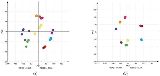 The impact of retention time adjustment to the PCA of Matricaria recutita L. HPLC data. (a) The PCA clusters for raw chamomile extract HPLC data, 360 nm (extracts made from different Matricaria recutita L. samples are shown in different colors, extracts were made in triplicate); (b) the PCA clusters for chamomile extract HPLC data with adjusted retention times (extracts made from different Matricaria recutita L. samples are shown in different colors, extracts were made in triplicate).